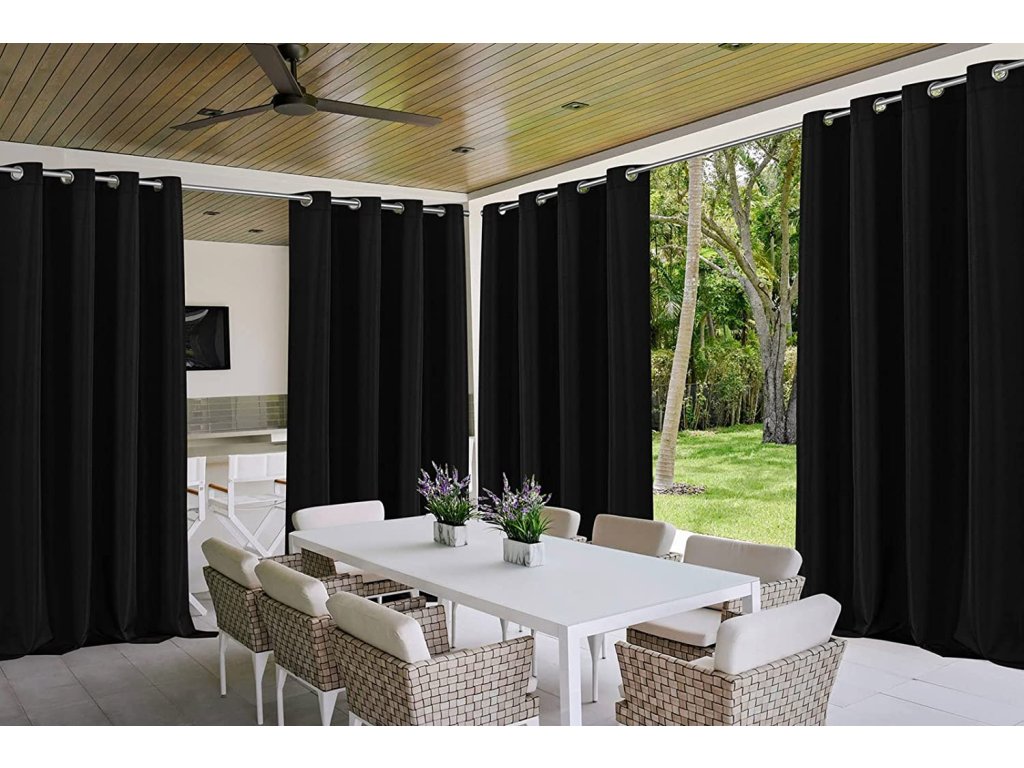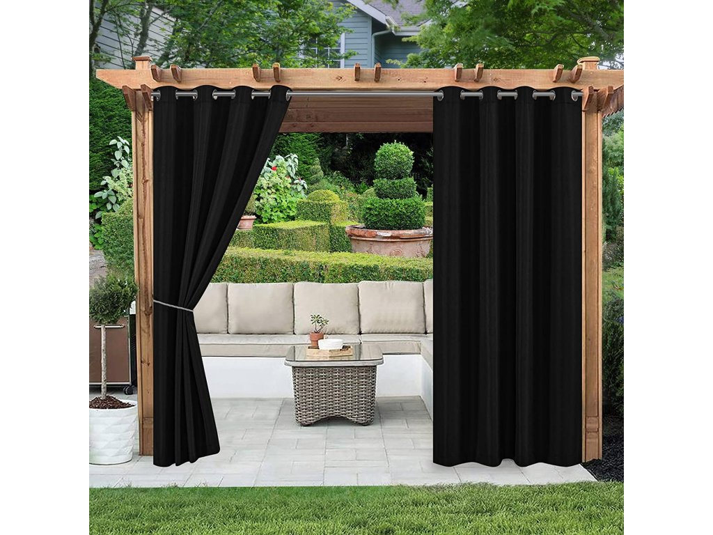 Venkovní vodotěsné závěsy, 1 pár (2 ks), rozměr 132x213 cm, elegantní černá barva. Ochrana před povětrnostními vlivy, vodou a slunečním zářením. Jednoduchá instalace na tyčovou garnyž díky kroužkům. Ideální pro pergoly, balkóny či altány. Funkční ochrana a stylový doplněk venkovních prostor.